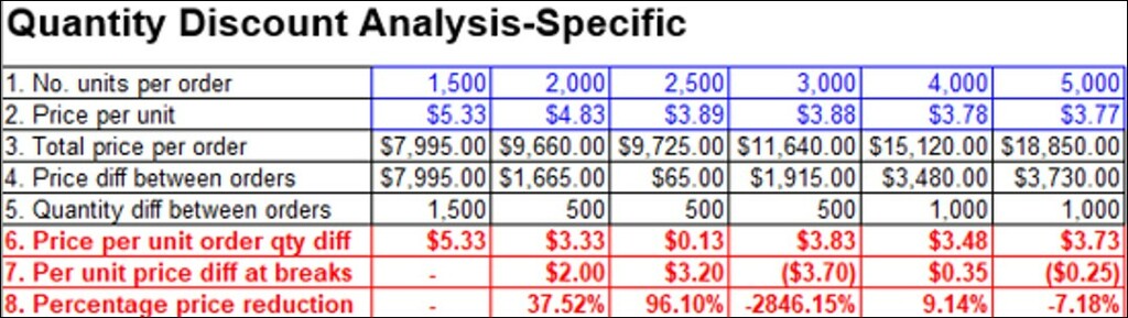 The example below is an actual quote analysis using the SourcingApp tool. In Column 3, the quantity difference between orders is 500 and the unit cost is an astounding 13¢ each. A 96% reduction in price per unit.