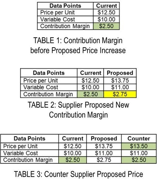 Step 5: Find the price increase percent that maintains the Contribution Margin at $2.50. As shown in the chart below in green highlight, a price increase of 3.66% will cover the 10% increase in Variable Costs while avoiding a Windfall Profit for the supplier. The buyer counters the proposed price increase with an evidence-based $12.9576 offer and the negotiation begins.
