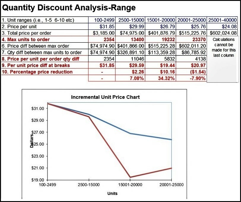 MAXIMUM QUANTITY TO PURCAHSE IN EACH RANGE: Row 4 shows the maximum quantity to order in each range. In the first range the maximum units to order are 2,354. Why? Because you can buy 2,500 for the same cost as 2,354 ($74,975). Similar results in other breaks.