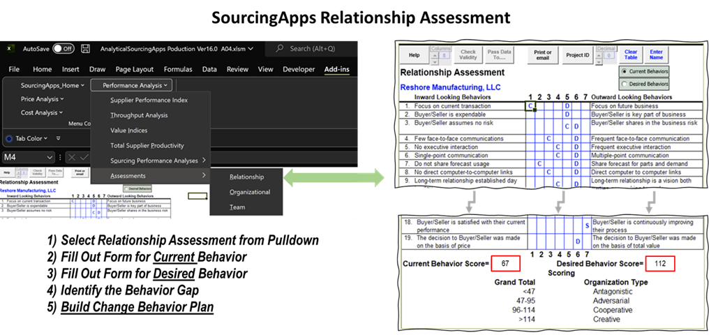 The below graphic shows how to access the Relationship Assessment in SourcingApps. Run the assessment for both Current and Desired behavior. Comparing both assessments identifies a Behavior Gap and, if needed, a Change Behavior Plan can be easily constructed.